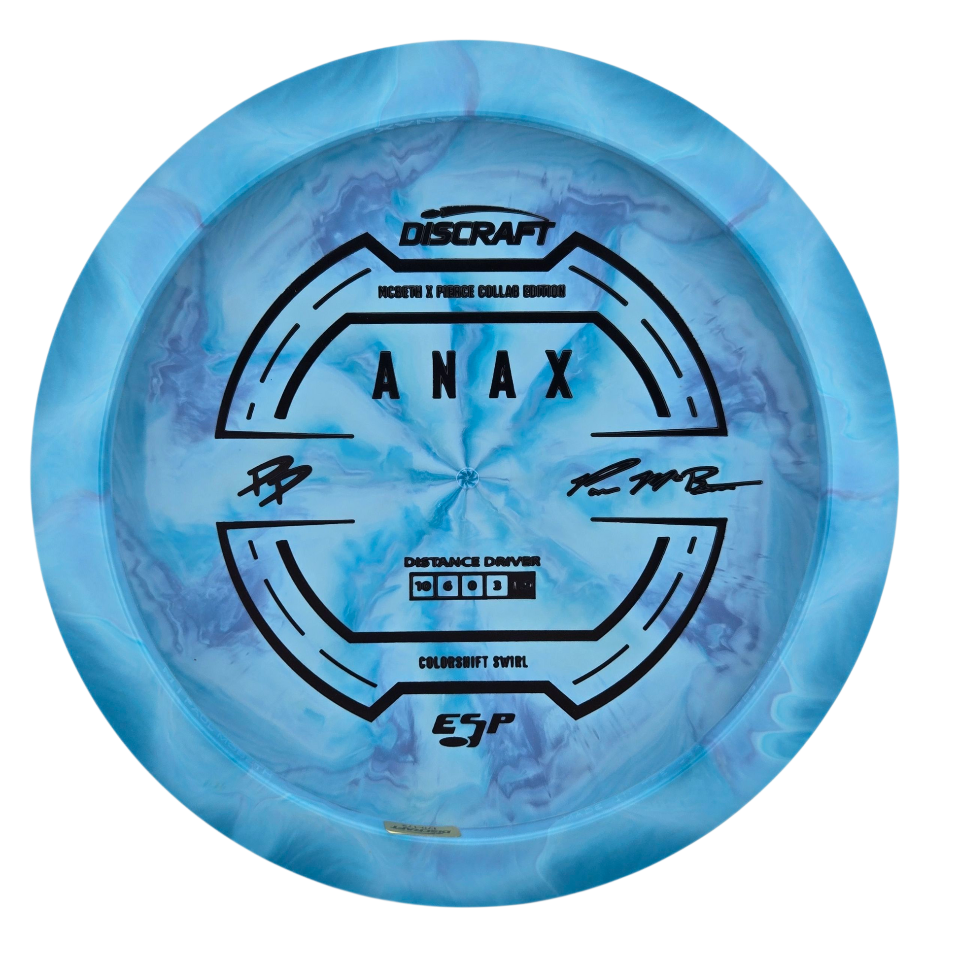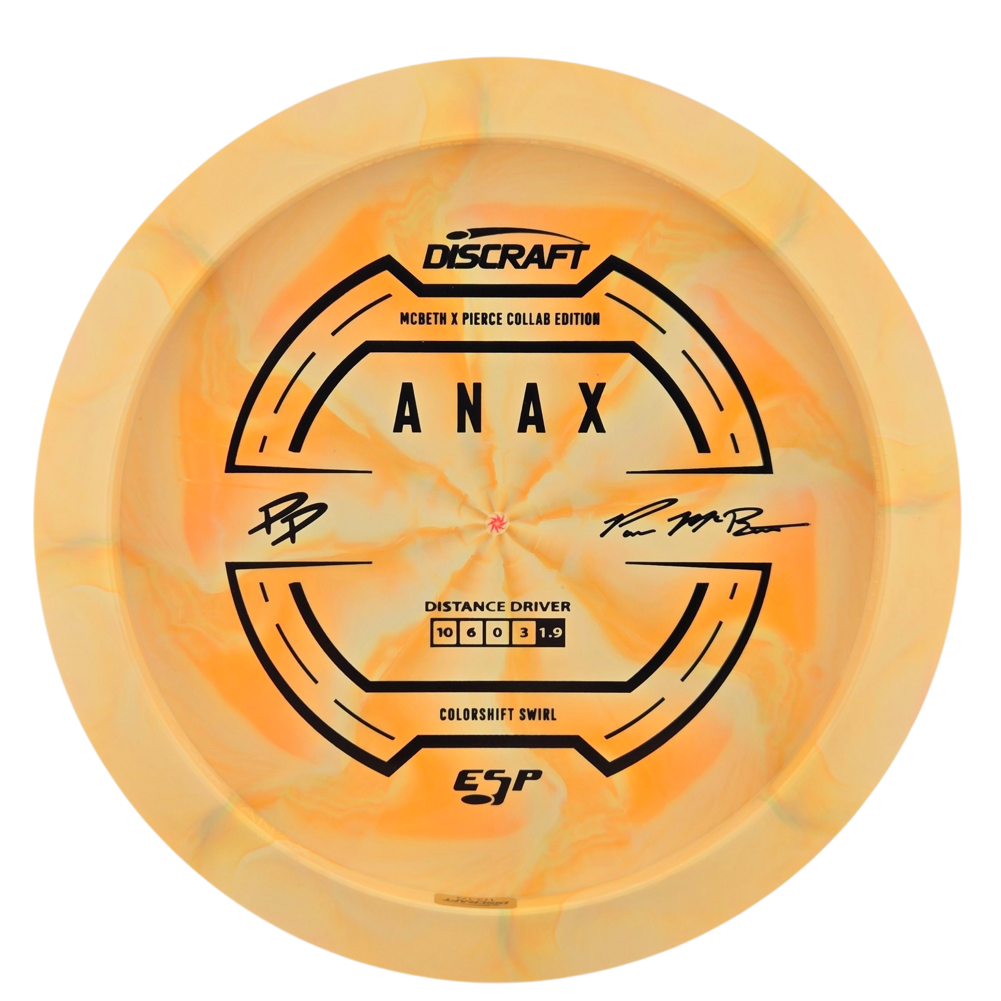 The Anax is a driver with elite carry and a trustworthy fade—now available in a special Paul McBeth & Paige Pierce GMC collab that nods to the fan-favorite “1060 Anax.” The stiff, slightly domed profile adds glide and a crisp, connected release. Complimening the original release, you’ll find a bottom stamp that lets the swirls and color patterns take center stage.