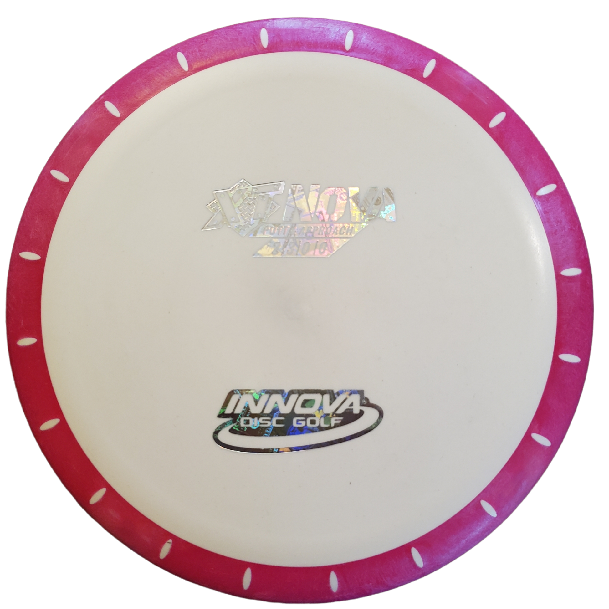 An overmold putt and approach disc that features a firm flight plate and soft grippy rim. The Nova is a unique putter designed with overmold technology. The flight plate is made from a firm Pro material that's fused to a grippy putter Pro plastic rim. The soft rim absorbs impact and sticks the landing while the firm flight plate allows for powerful throws making the Nova an excellent putter and approach disc.
