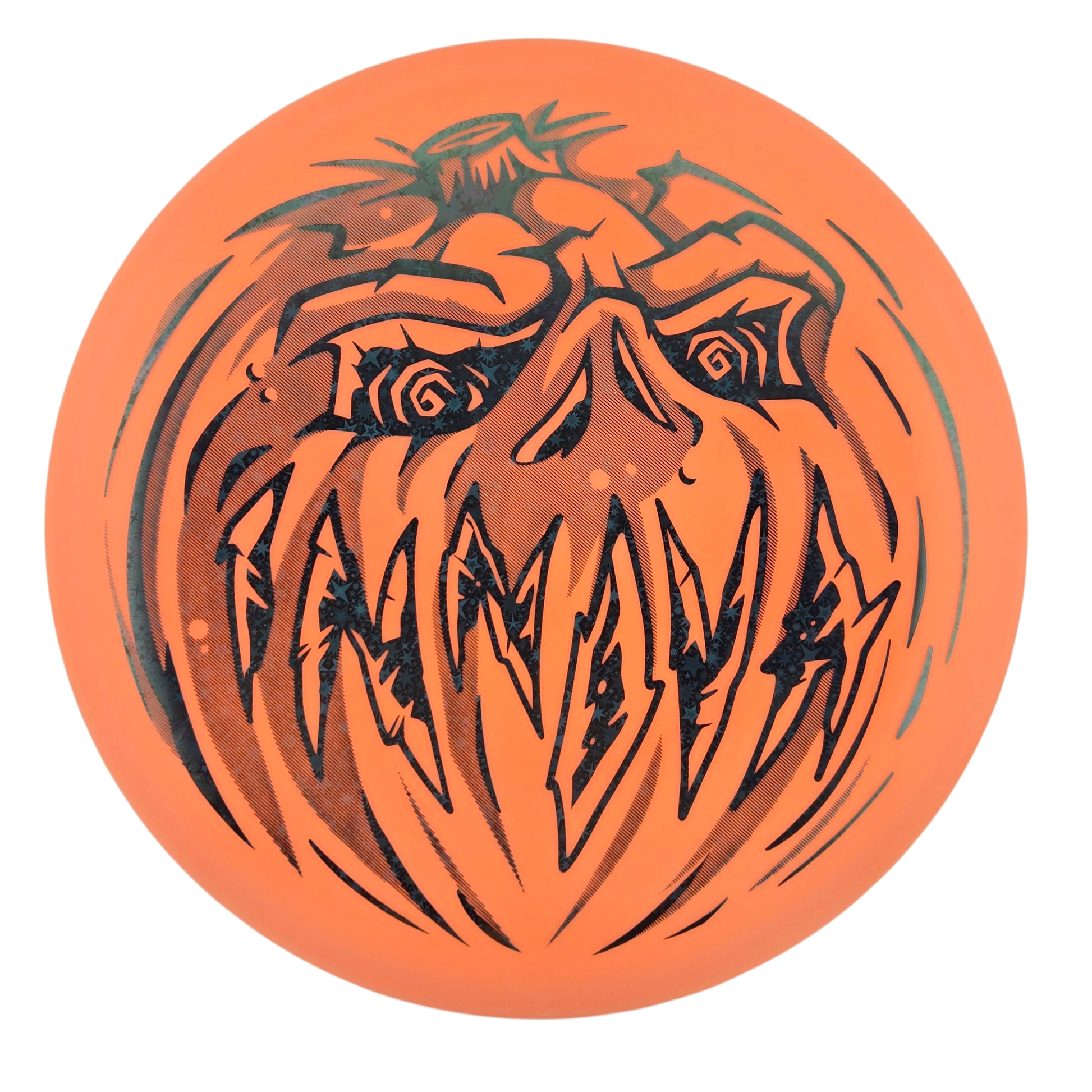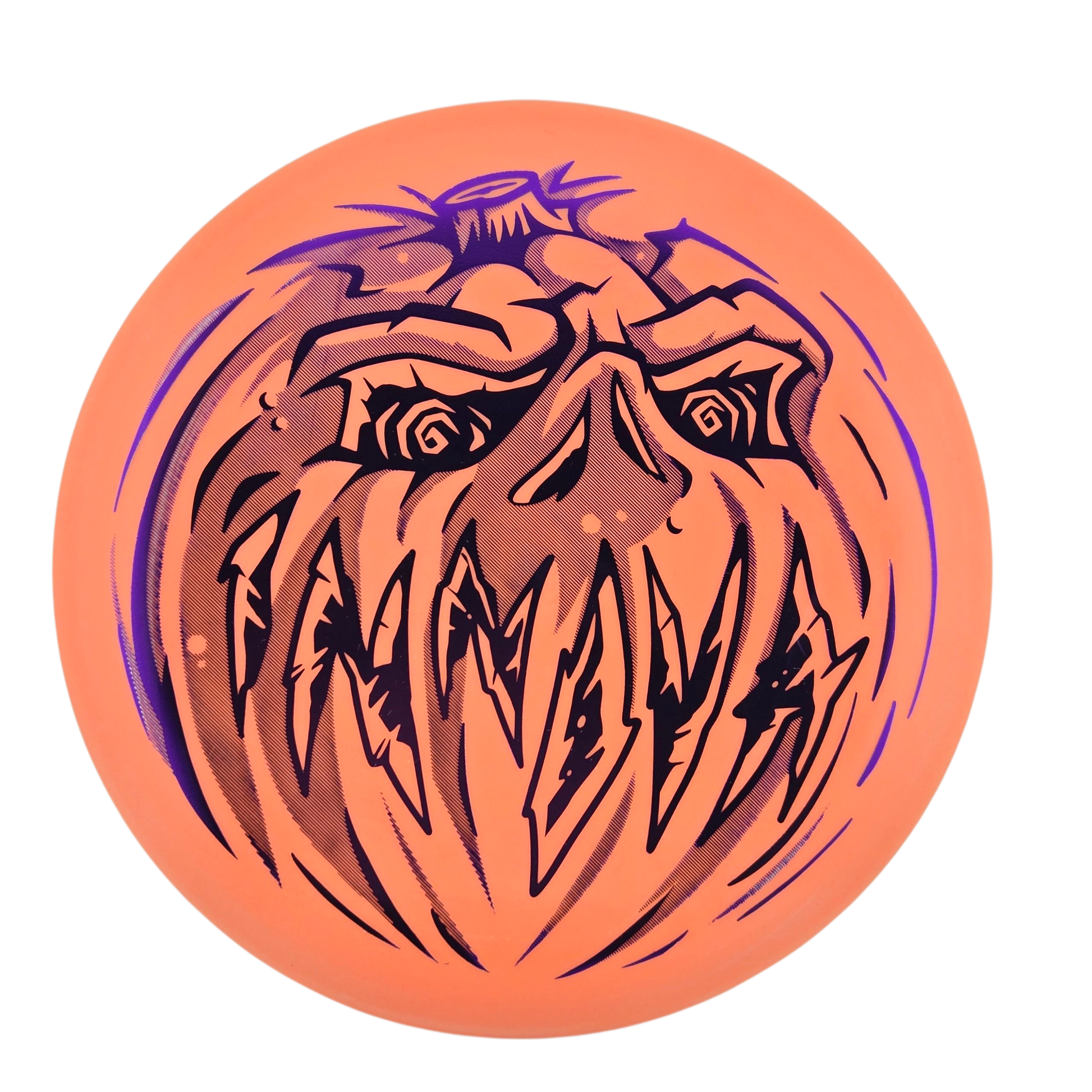 A fiendish grin is the centerpiece of the XXL hotstamp for this year's Innova Pumpkin disc—a tradition now in its 29th season. Built for the dark, the Proto Glow Nexus Aviar is easy to see and keeps its grip when the temps drop and other plastics start to slip. Read more about the history of the Innova Pumpkin disc.